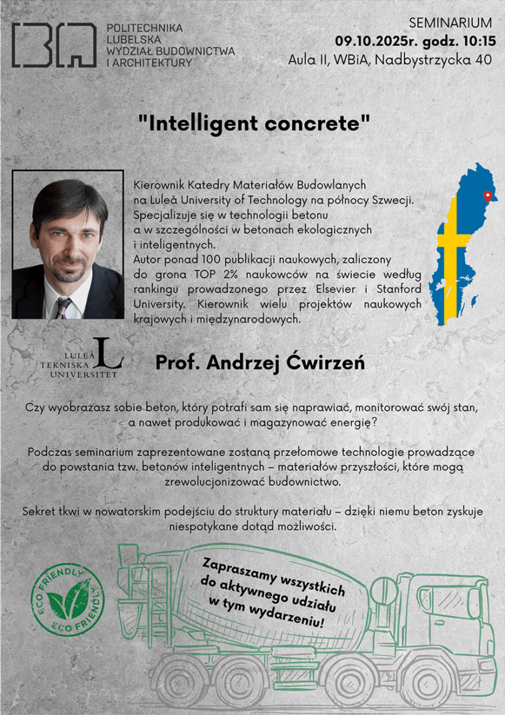 Politechnika Lubelska będzie gościć prof. Andrzeja Ćwirzenia – Kierownika Katedry Materiałów Budowlanych na Luleå University of Technology w Szwecji, uznanego specjalistę w dziedzinie technologii betonu. Profesor, zaliczany do grona 2% najlepszych naukowców na świecie według prestiżowego rankingu Elsevier i Stanford University, wygłosi w Lublinie dwa seminaria naukowe poświęcone przyszłości ekologicznych i inteligentnych betonów.