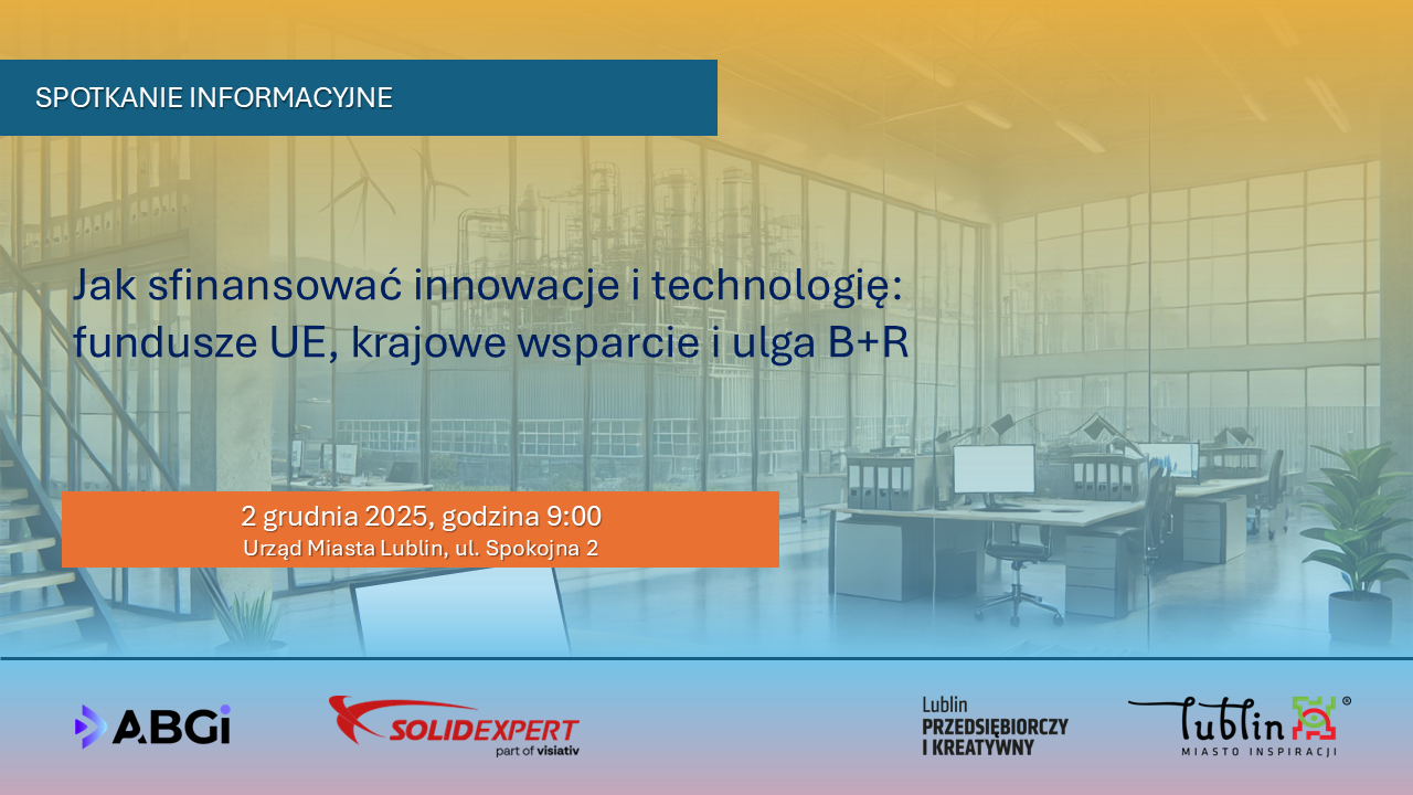 Urząd Miasta Lublin – Wydział Kultury, referat Centrum Przedsiębiorczości i Przemysłów Kreatywnych wraz z firmą ABGI Poland i Solidexpert zapraszają na spotkanie informacyjne pt. „Jak sfinansować innowacje i technologię: fundusze UE, krajowe wsparcie i ulga B+R”.