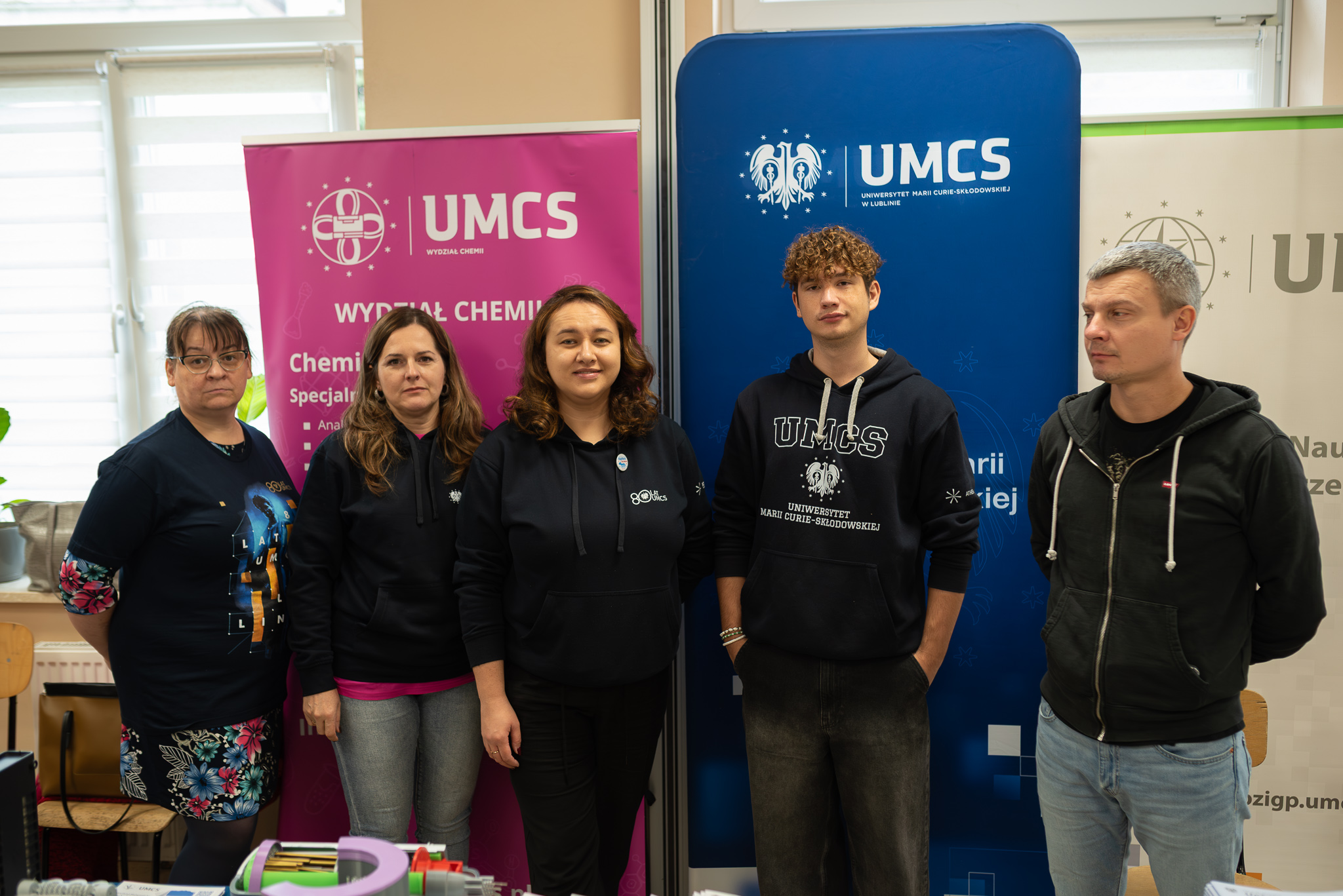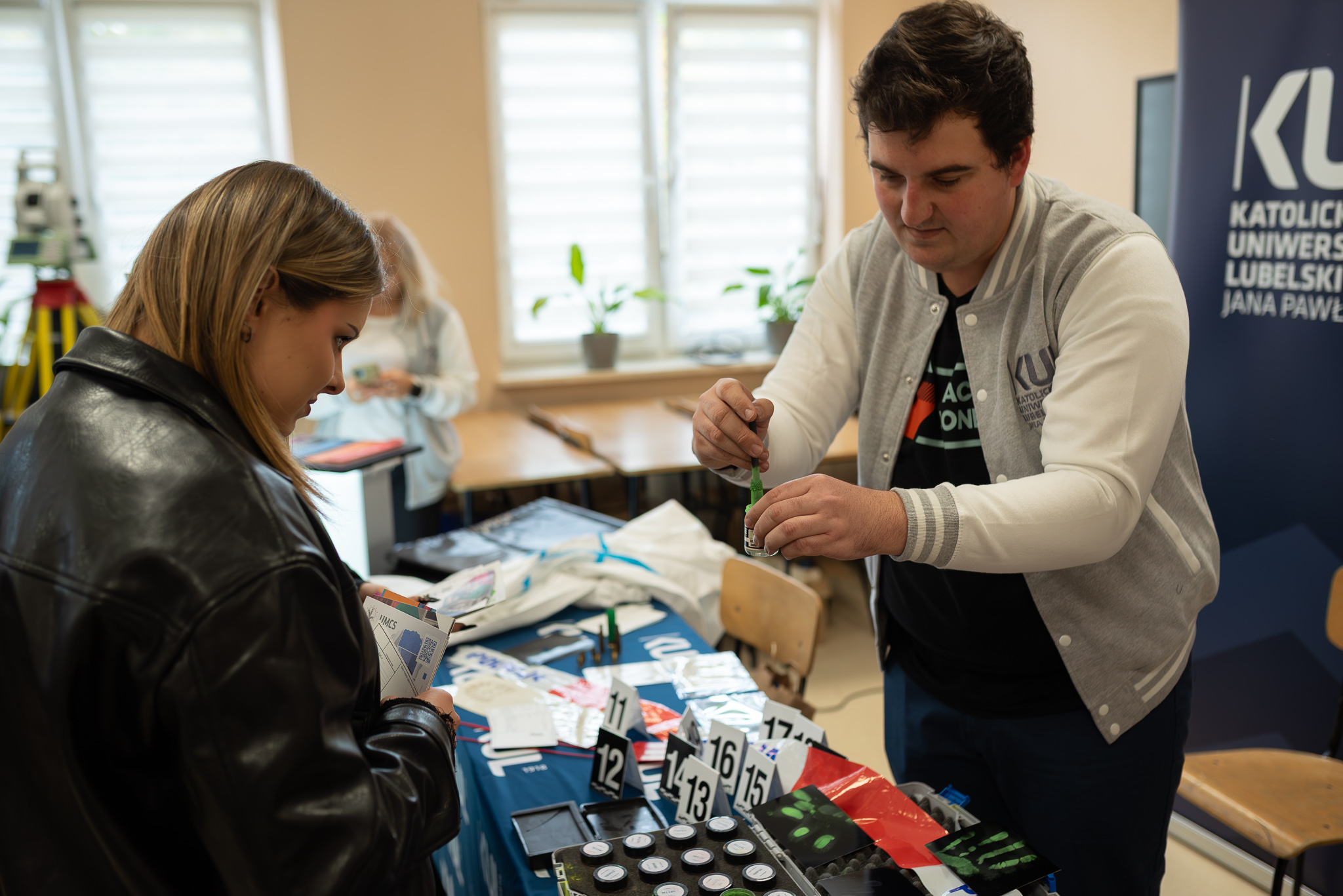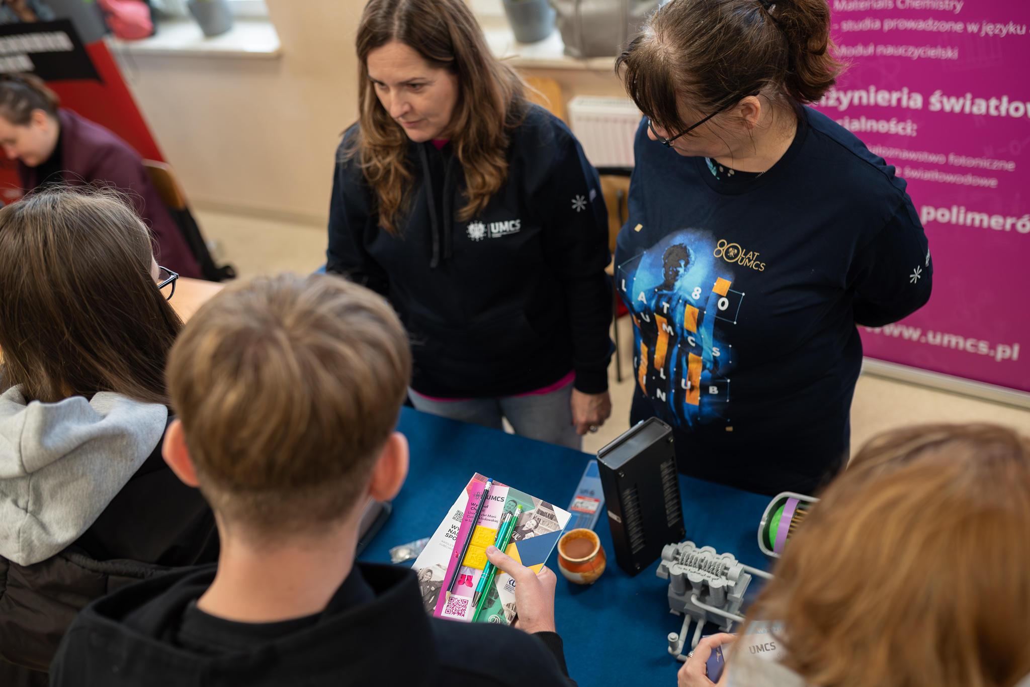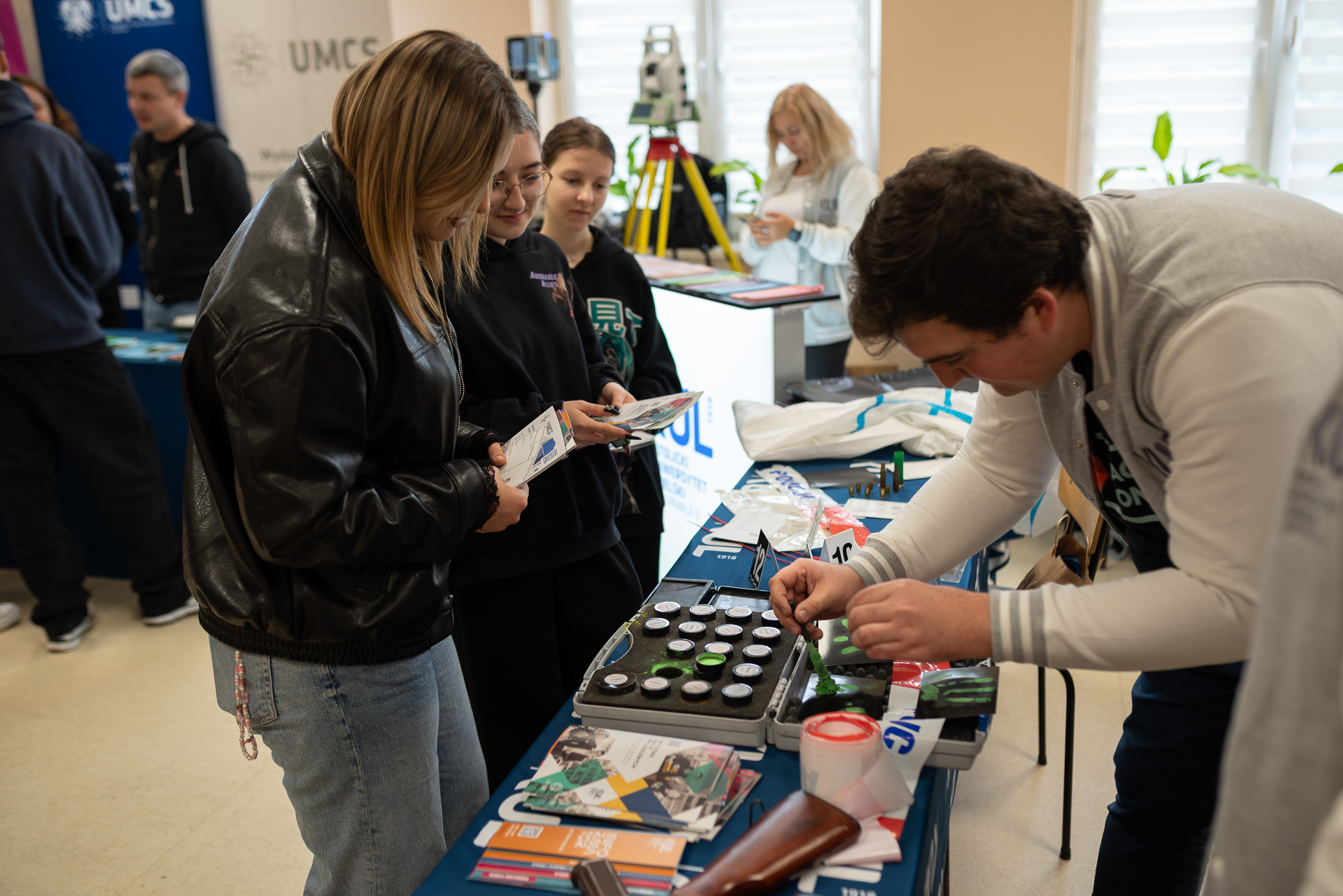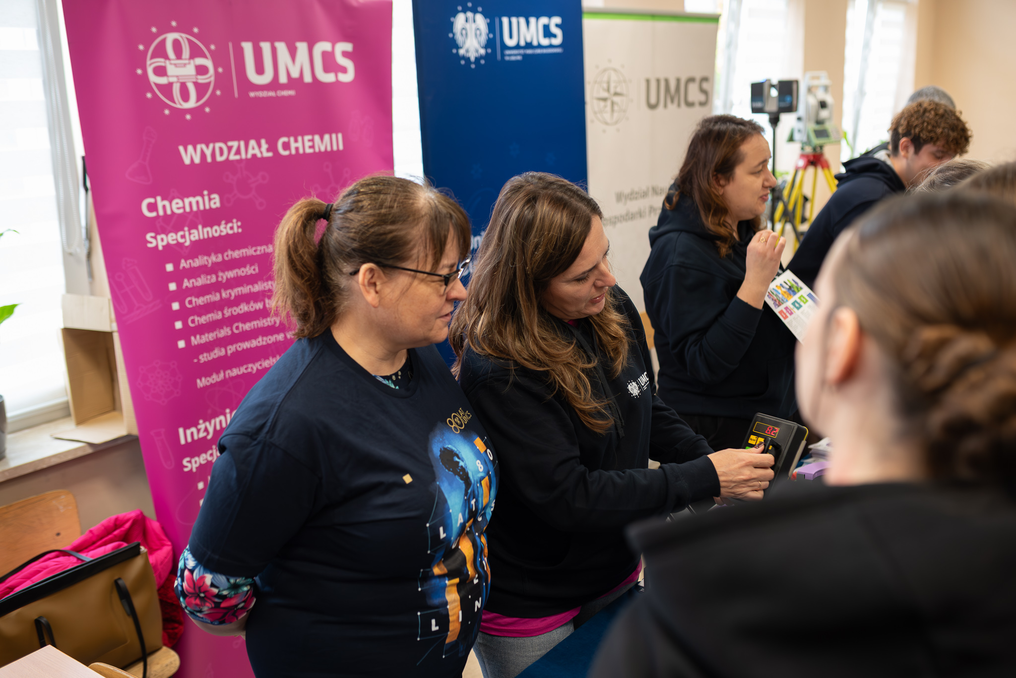 Prof. dr hab. Małgorzata Wiśniewska oraz dr hab. Ewa Skwarek, prof. uczelni z Katedry Radiochemii i Chemii Środowiskowej Wydziału Chemii przybliżyły temat oddziaływania promieniowania jonizującego z materią. Zaprezentowały mierniki promieniowania wyposażone w liczniki Geigera-Müllera, którymi młodzież mogła wykryć podwyższone poziomy promieniotwórczości nie tylko w próbkach środowiskowych, a także przedmiotach użytkowych. Ponadto poruszano zagadnienia związane z bezpieczeństwem radiacyjnym oraz radiochemią