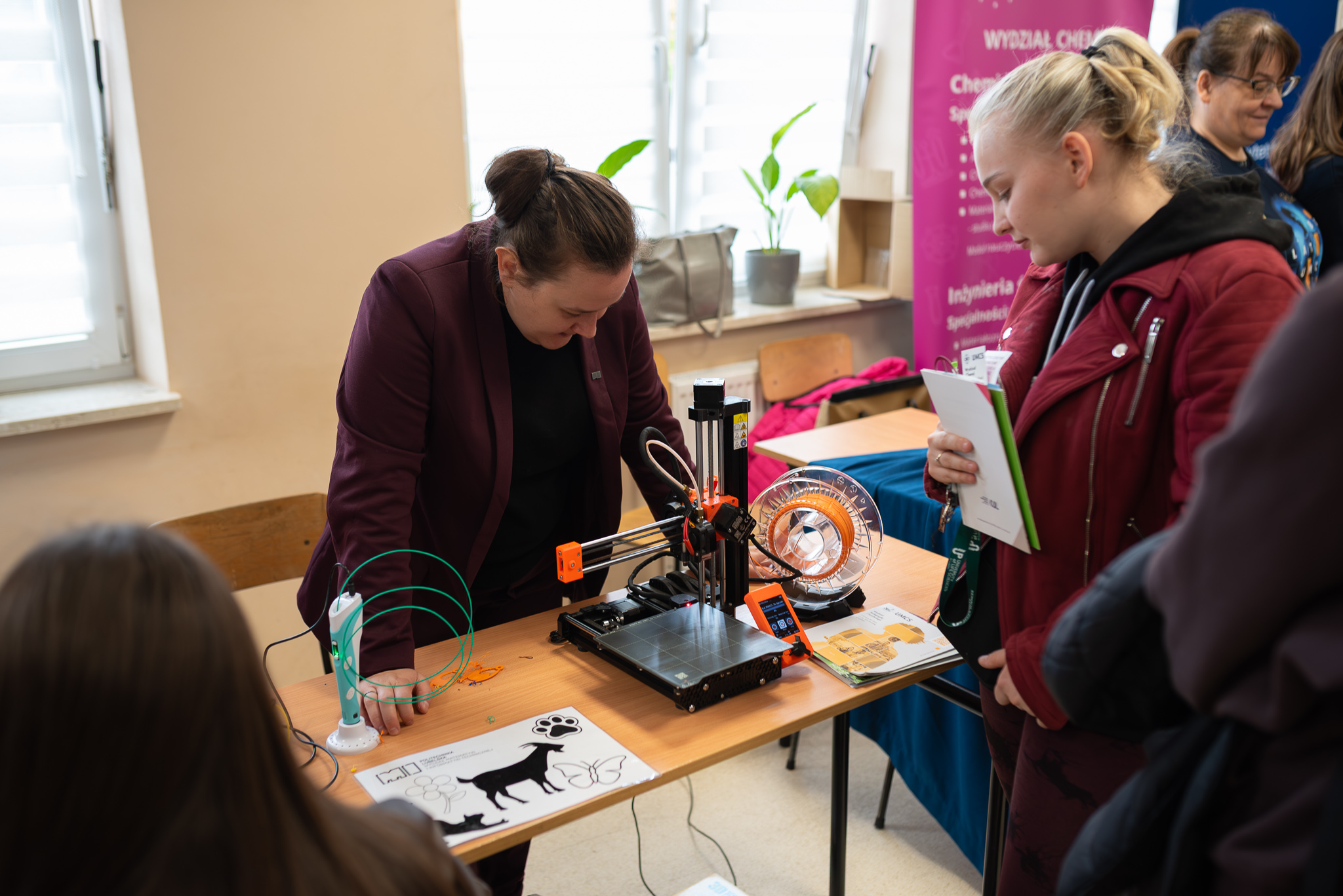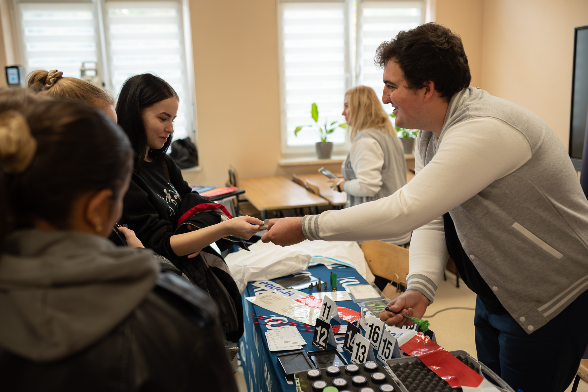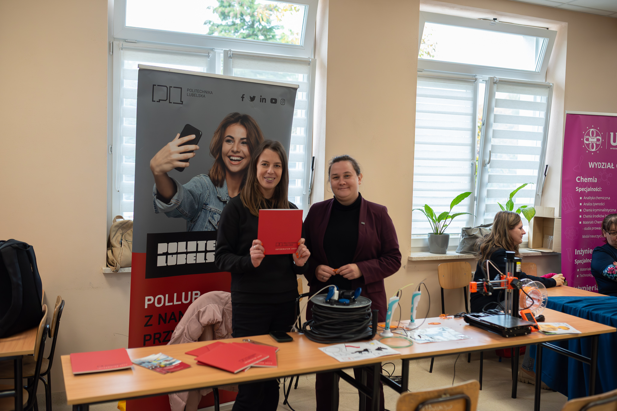 Laura Kazanowska przybliżyła temat systemów zapisu liczb, a Jakub Pilchoń zaprezentował zastosowania wizji komputerowej. Prowadzący chętnie odpowiadali na pytania uczniów dotyczące studiów na Politechnice Lubelskiej. Z kolei mgr inż. Magdalena Piłat-Rożek wraz z Sylwią Pikur (Centrum Komunikacji i Marketingu) opowiadały o bogatej ofercie edukacyjnej, życiu kampusowym oraz możliwościach rozwoju w organizacjach i kołach naukowych.