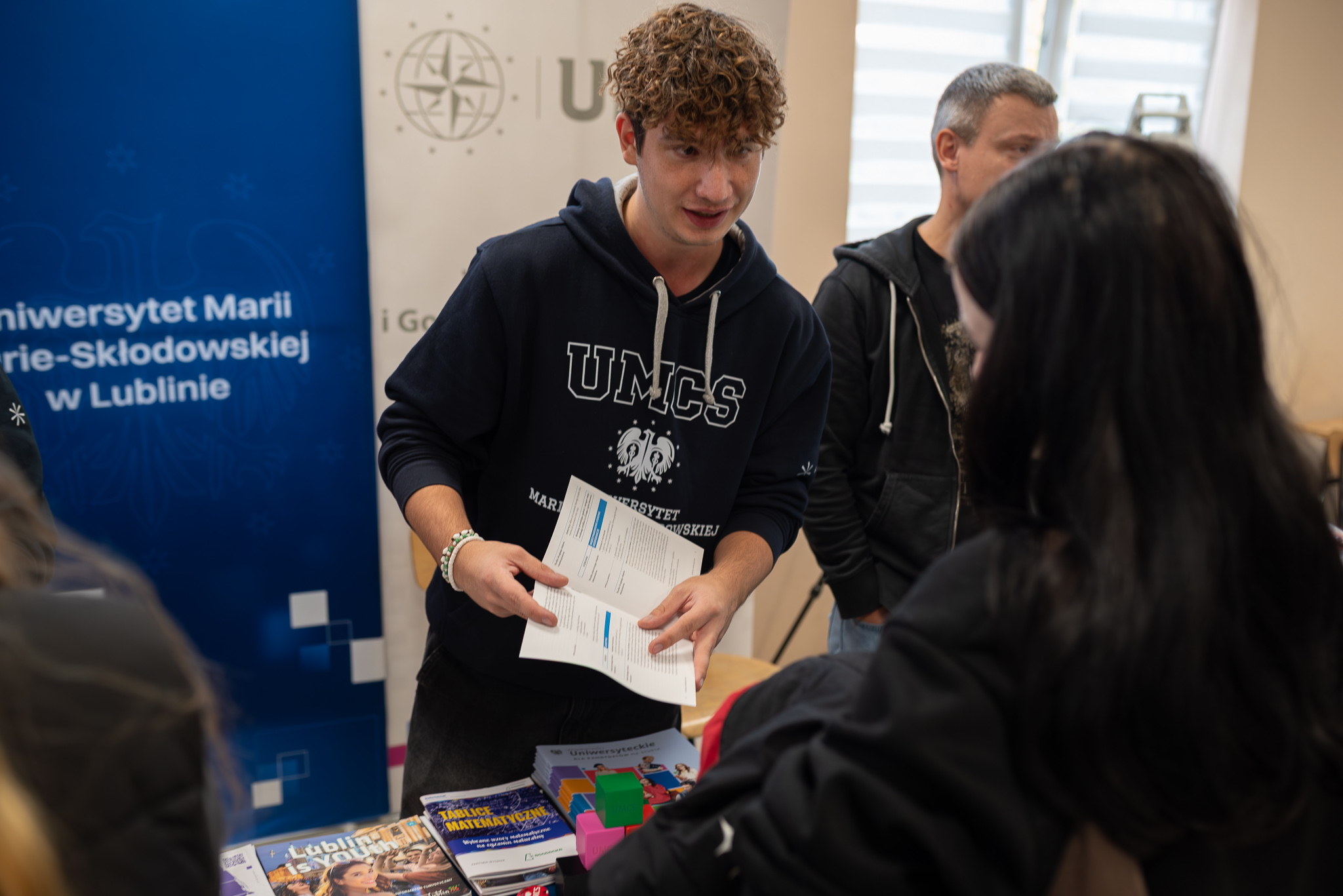 Ofertę rekrutacyjną na rok akademicki 2025/2026 oraz informacje o uczelni, życiu studenckim i mieście przybliżyli Magdalena Drwal z Centrum Promocji oraz Roman Knysh (student) z Wydziału Matematyki, Fizyki i Informatyki. Pokazali, że studiowanie na UMCS to nie tylko nauka, ale również przygoda, rozwój pasji i udział w inspirujących projektach.