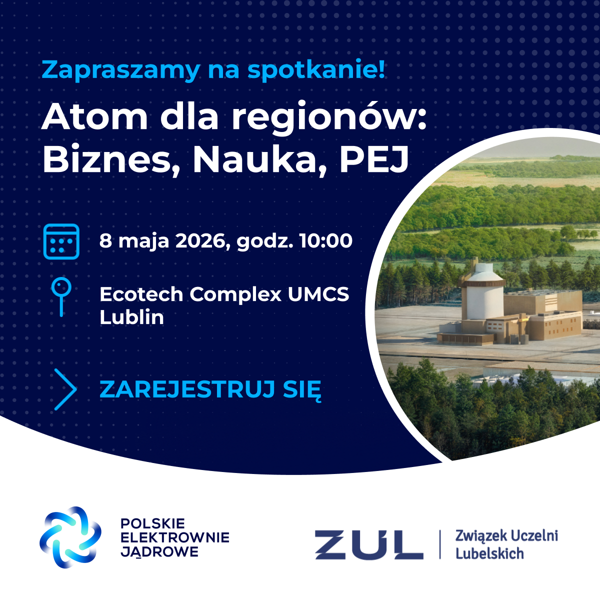 Związek Uczelni Lubelskich zaprasza do udziału w konferencji „Atom dla regionów: Biznes, Nauka, PEJ”, która odbędzie się 8 maja 2026 roku w godzinach 10:00 – 13:00 w ECOTECH-COMPLEX (Centrum Analityczno-Programowe dla Zaawansowanych Technologii Przyjaznych Środowisku, ul. Głęboka 39, Lublin).